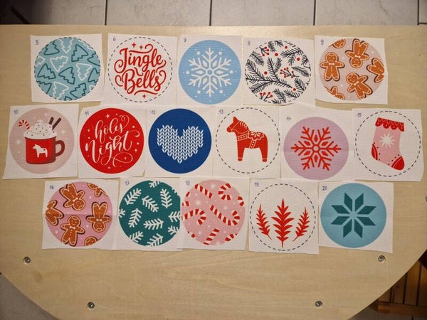 Runder Untersetzer mit Stoff-Inlay mit Weihnachtsmotiven.